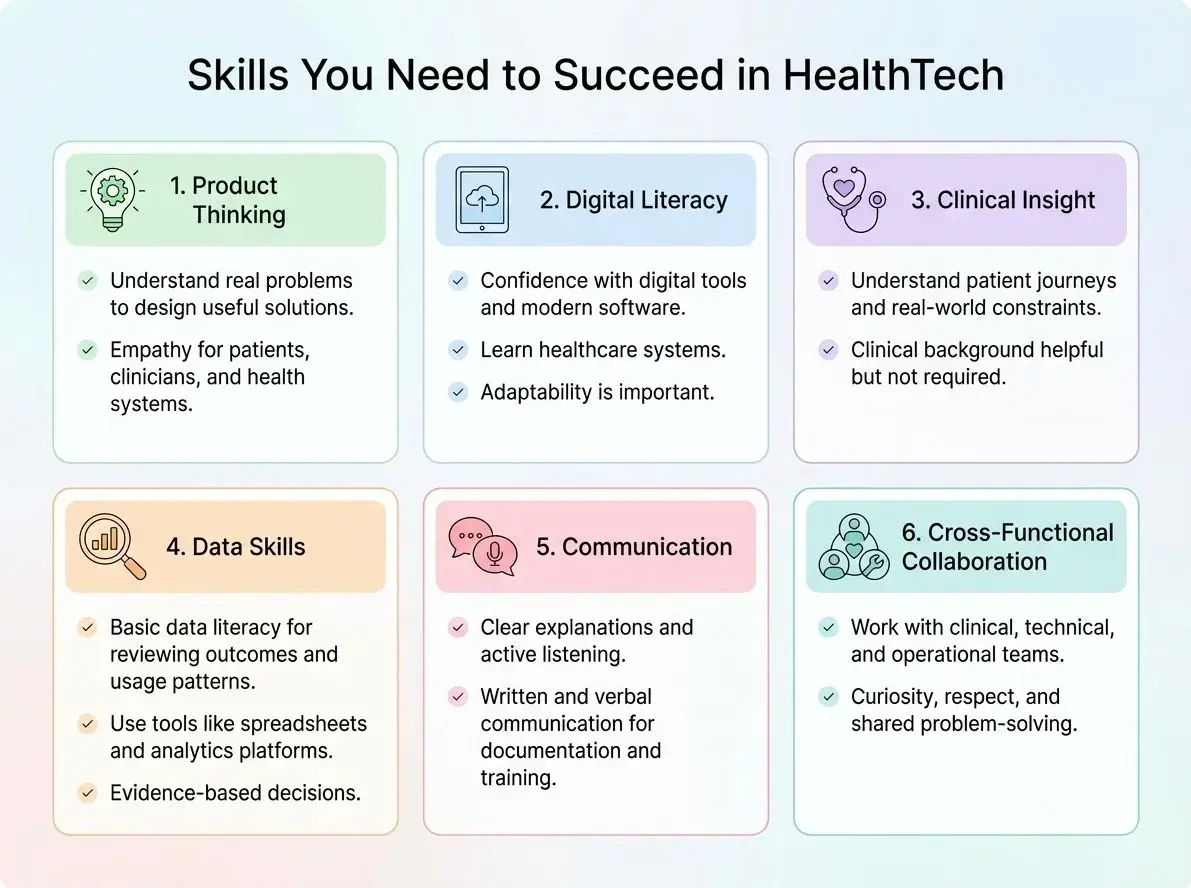 The skills you need to succeed in HealthTech are a blend of product thinking, digital confidence, clinical understanding, data literacy, communication and collaboration. You do not need to master everything immediately. What matters most is your willingness to learn and your curiosity about how technology can genuinely improve healthcare.